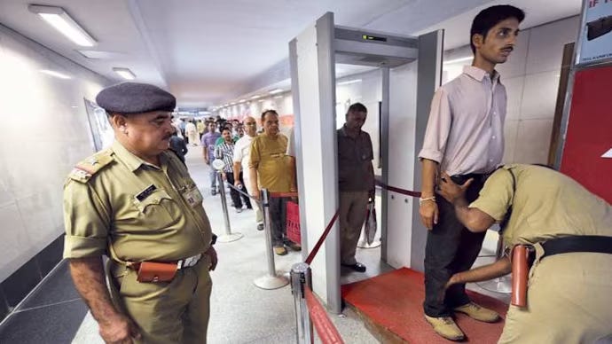 A queue to the metal detector at a Delhi Metro station, with CISF personnel performing security checks. (Source: India Today)